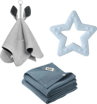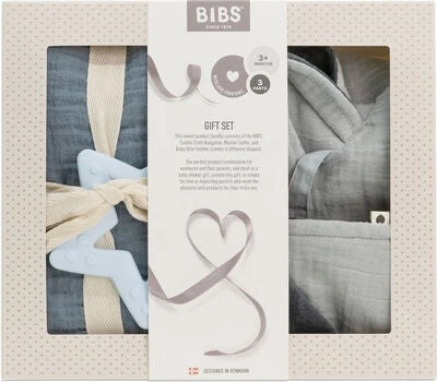 Geschenkset von BIBS mit drei Teilen. Das Set beinhaltet einen Känguru-Schnuller, zwei Musselindecken und einen Baby Bitie Beißring. Perfekt als Geschenk zur Babyparty oder Taufe.