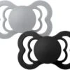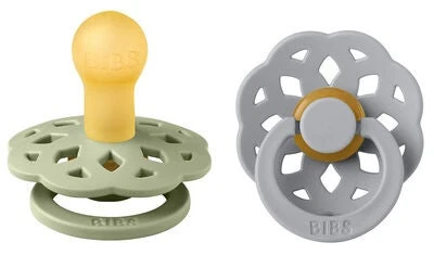 Schöne, grüne, graue Boheme Schnuller von BIBS im 2er-Pack aus Latex mit kleinen, strategisch platzierten Löchern zur Belüftung. Sie haben Sauger aus Naturkautschuk, der Dein Kind beruhigt.