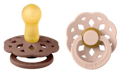 2 schöne, braune und rosa Boheme Schnuller von BIBS aus Latex mit kleinen, strategisch platzierten Löchern zur Belüftung. Sie haben einen Sauger aus Naturkautschuk, der Dein Kind beruhigt.
