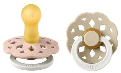 2 schöne, rosa und weiβe Boheme Schnuller von BIBS aus Latex mit kleinen, strategisch platzierten Löchern zur Belüftung. Sie haben einen Sauger aus Naturkautschuk, der Dein Kind beruhigt.