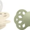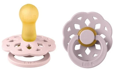 Schöne, rosa, lila Boheme Schnuller von BIBS im 2er-Pack aus Latex mit kleinen, strategisch platzierten Löchern zur Belüftung. Sie haben einen Sauger aus Naturkautschuk, der Dein Kind beruhigt.