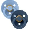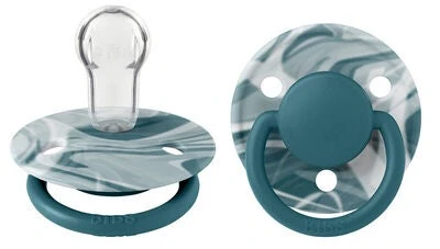 Niedliche, grüne, weiβe De Lux Schnuller von BIBS im 2er-Pack aus Silikon mit einem abgerundeten Schild. Das Produkt ist 100 % frei von PVC, BPA und Phthalaten.