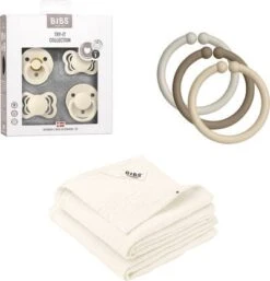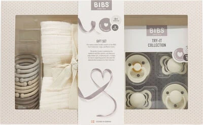 Newborn Geschenkset von BIBS. Enthält die Try-It-Kollektion mit vier Schnullern, drei Loops und zwei Musselindecken. Perfekt als Geschenk zur Babyparty oder Taufe.