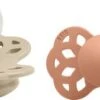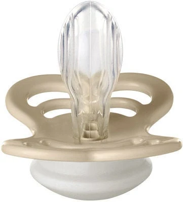 Der Schild ist leicht und mit großen Luftlöchern versehen, um die bestmögliche Luftzirkulation um den Mund zu gewährleisten. Dank der Brustwarzenform wird die Belastung auf Kiefer, Zahnfleisch und Zähne Deines Kindes verringert. Die Schnuller sind in Silikon und Naturgummi und in zwei Größen erhältlich.