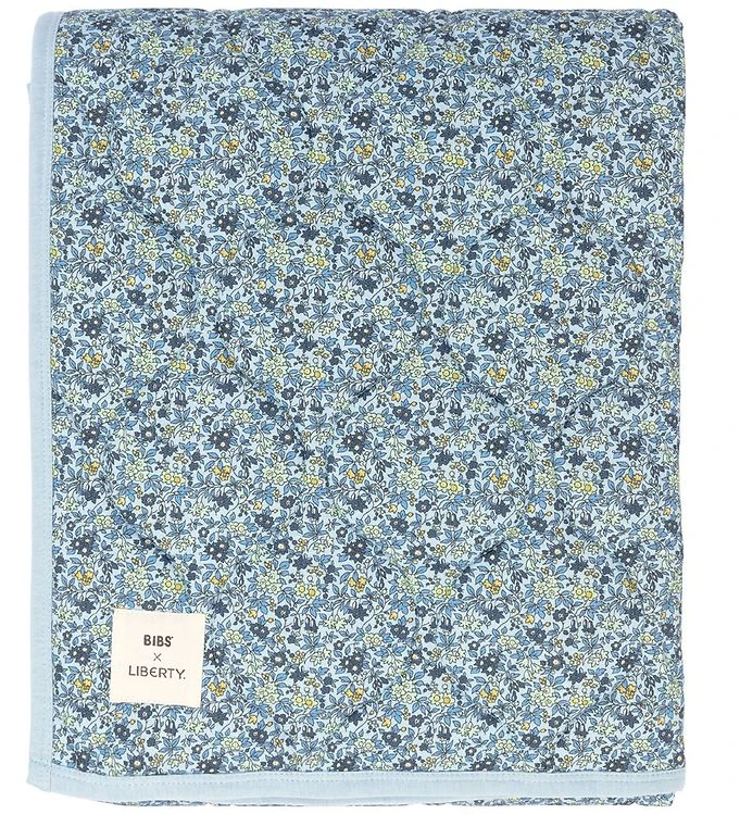 Smart Bibs x Liberty Decke in Blau mit einem Allover-Print aus kleinen Blumen in Blau und Grün. Der Decke hat eine Schöne gesteppt.