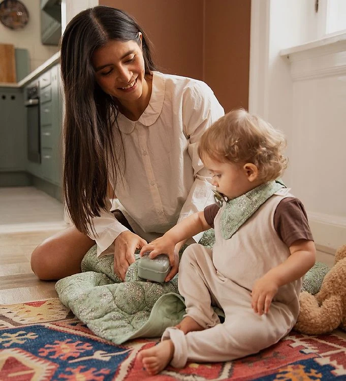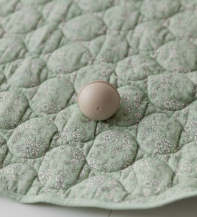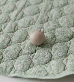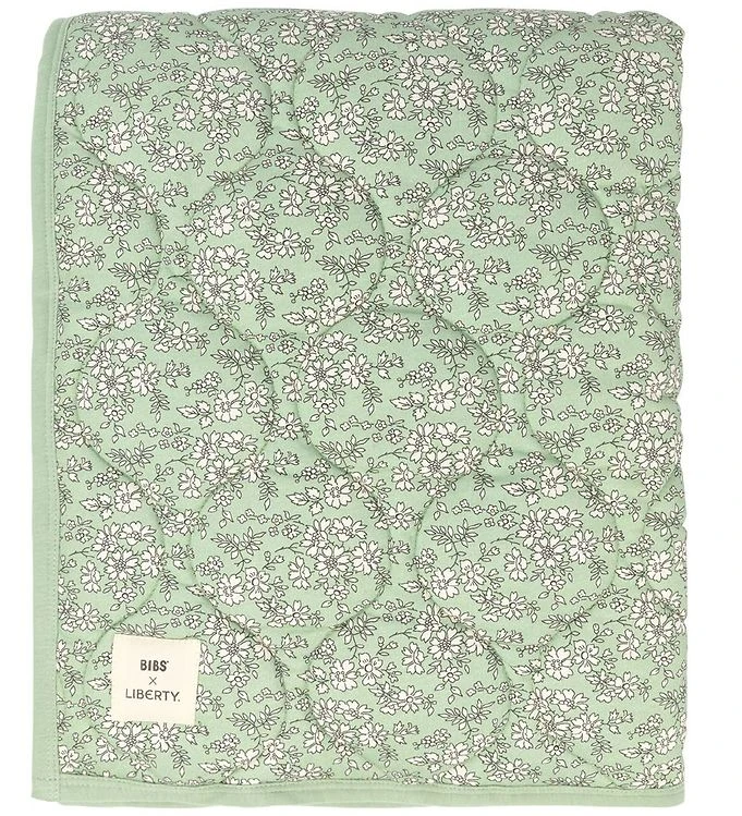 Smart Bibs x Liberty Decke in Grün mit einem Allover-Print aus kleinen Blumen in Weiß. Der Decke hat eine Schöne gesteppt.