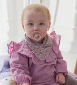 Die Bibs x Liberty Schnuller haben einen runden Schnullerkopf aus Naturgummi. Das Schild des Schnullers ist aus leichtem PP und hat ein kreisrundes und nach außen gerichtetes Design mit praktischen Luftlöchern, so dass Belästigungen durch die feuchte Umgebung und Vakuum auf der Haut des Kindes vermieden werden.