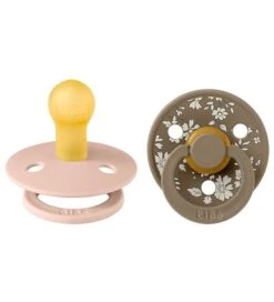Schöne Bibs x Liberty Schnuller im praktischen 2er-Pack in Pink und Braun mit feinem Print.