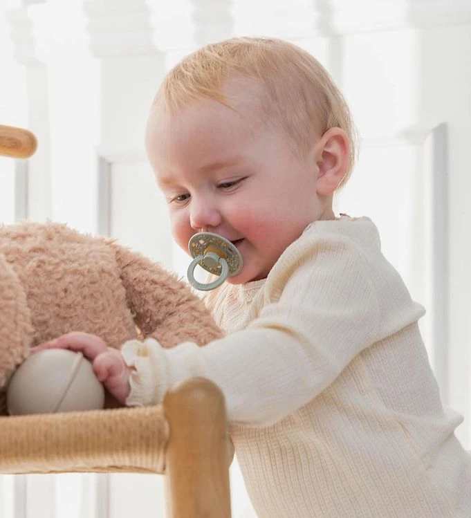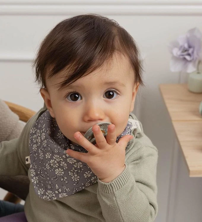 Die Bibs x Liberty Schnuller haben einen runden Schnullerkopf aus Naturgummi. Das Schild des Schnullers ist aus leichtem PP und hat ein kreisrundes und nach außen gerichtetes Design mit praktischen Luftlöchern, so dass Belästigungen durch die feuchte Umgebung und Vakuum auf der Haut des Kindes vermieden werden.