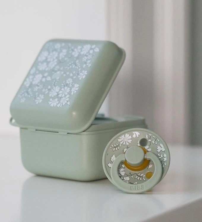 Die Bibs x Liberty Schnullerbox besteht aus einem Fach mit Platz für einen Schnuller und passt auf alle Bibs Schnuller. Neben Schnuller kann die Box auch kleinere Gegenstände und Lebensmittel enthalten. Die Schnullerbox macht es einfach, den Schnuller des Kindes überallhin mitzunehmen, und hat auf einer Seite einen Griff, um ihn zu befestigen.